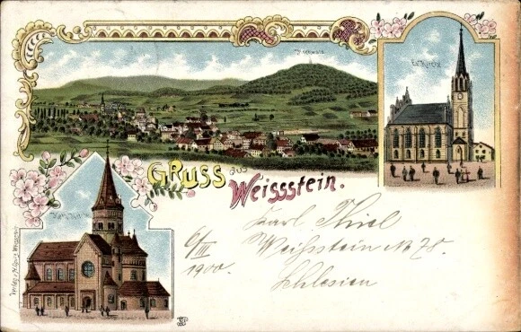 4.7. Postkarte aus Weißstein mit den 2 Kirchen, 1900, https://i.ebayimg.com/images/g/MPAAAOSw2xJnQRiV/s-l1600.webp, Zugang 23.01.2025.
